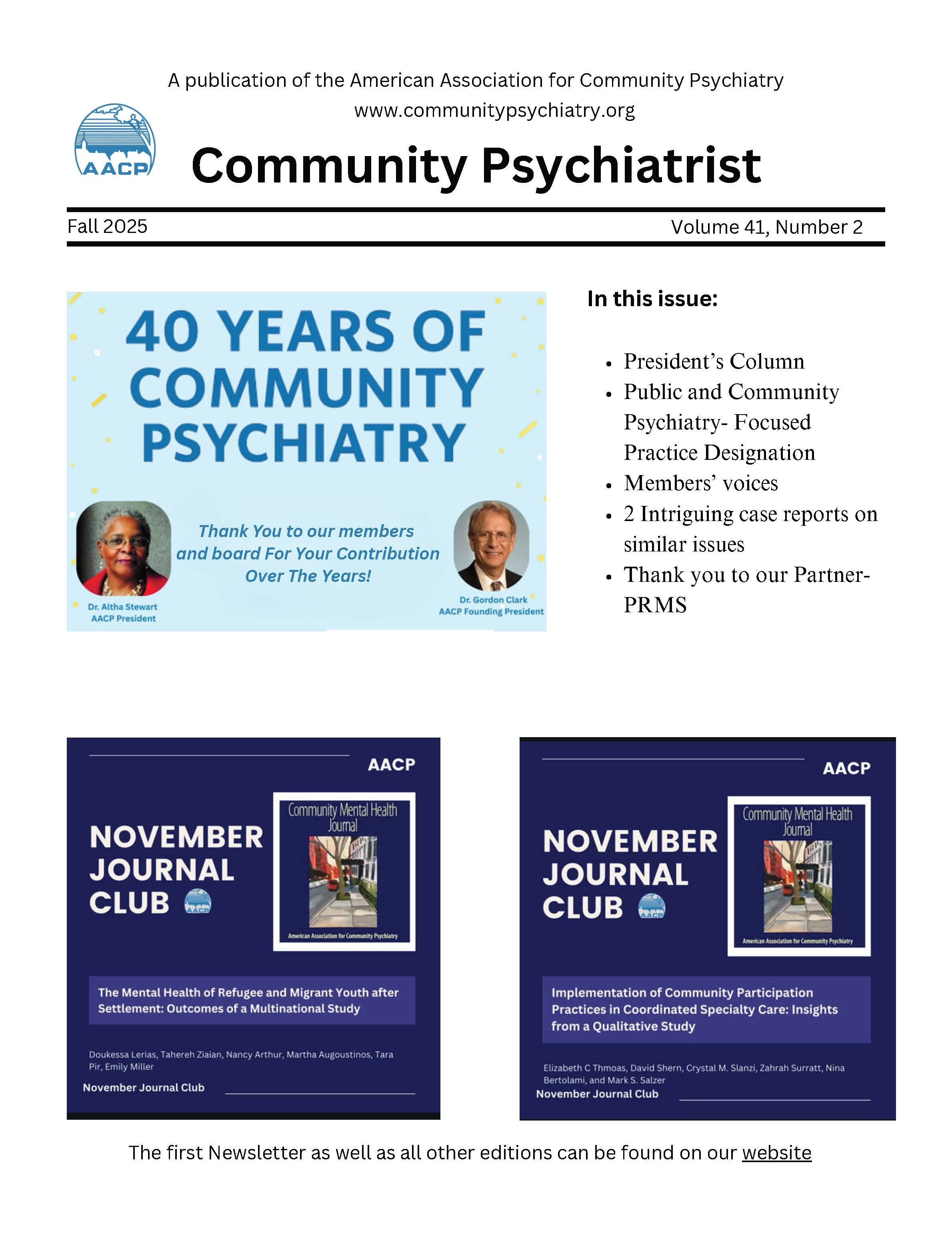 The AACP Newsletter is published three times annually and features topics ranging from recovery stories, ethics in community psychiatry, preventing burnout, clinical issues and politics in mental health.